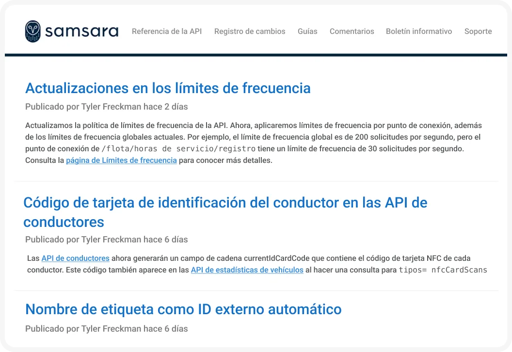 Estas API cubren todas las áreas principales de productos de Samsara, como telemática, seguridad, conductor conectado y gestión industrial.
