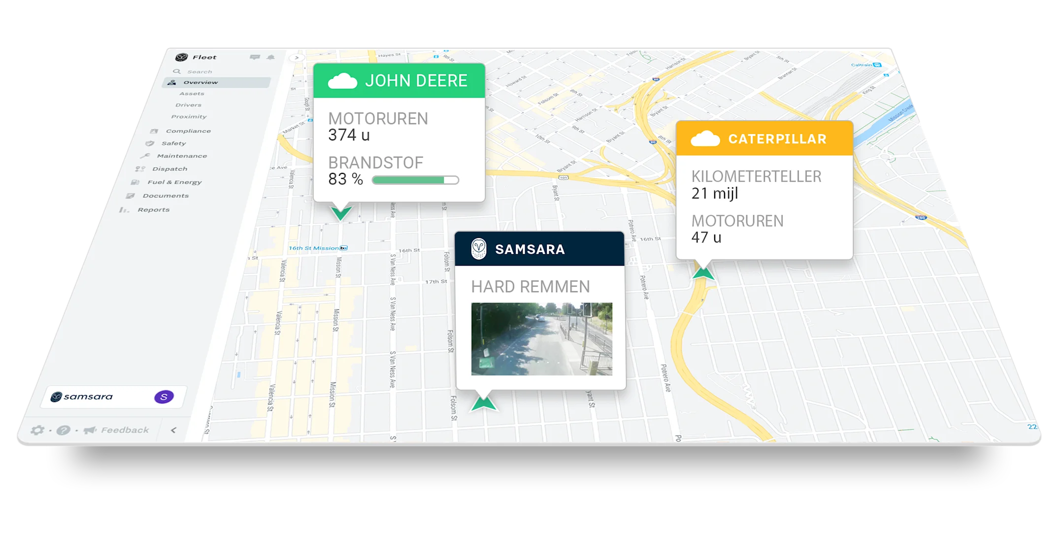 Samsara integreert met fabrikanten uit verschillende sectoren, waaronder lichte, middelzware en zware voertuigen, opleggers, en bouw- en zwaar materieel, zodat wagenparken gemakkelijk de gegevens kunnen krijgen die ze nodig hebben zonder nieuwe hardware te installeren.