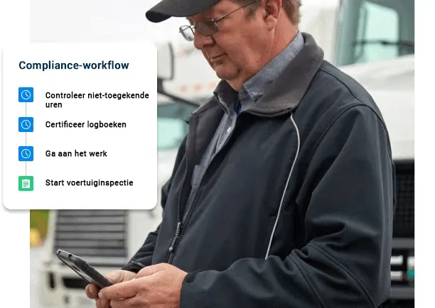 Verbeter de efficiency met gedigitaliseerde workflows en zicht op de belangrijkste compliance gegevens. Toegang tot rapportage voor tachografen, voertuig-inspecties en meer.