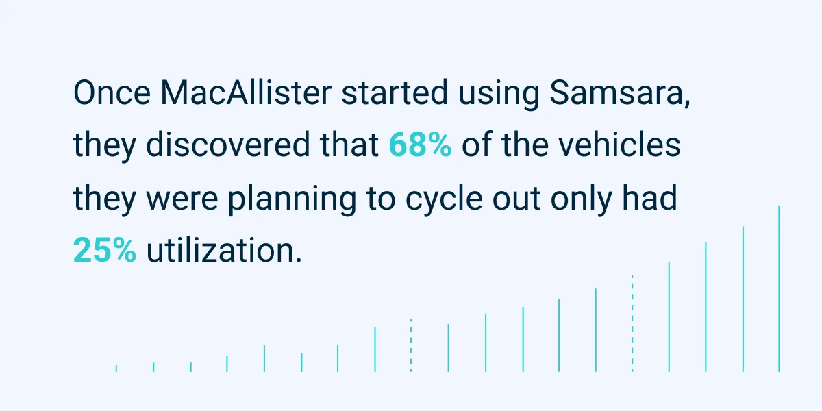 Before Samsara, construction and heavy equipment dealer MacAllister cycled out their vehicles every 36-months—but not for any particular reason. “We were caught in this trap of using anecdotal information for utilization,” said Bill Dollard, MacAllister’s Corporate Fleet Director. But once MacAllister started using Samsara, they were able to make data-informed decisions about utilization. For instance, they discovered that 68% of the vehicles they were planning to cycle out only had 25% utilization.