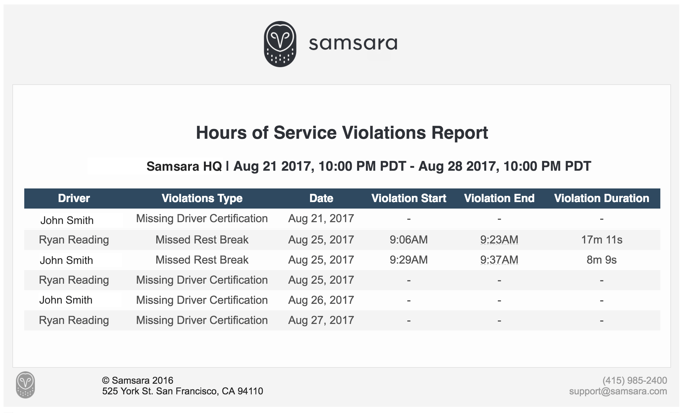Subscribe nowAs the deadline for ELD compliance fast approaches, we’re excited to announce a new Hours of Service (HOS) Violations Scheduled Report that leverages the Samsara ELD solution to gain automatic visibility into violations, enabling you to more easily identify and correct non-compliant driver behavior.