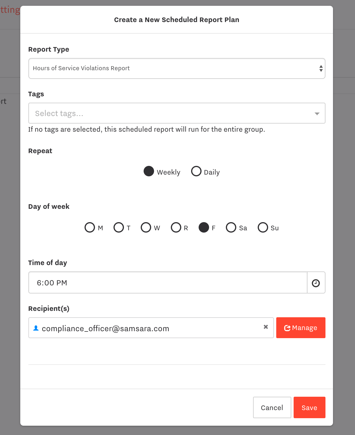 Step Two - Select “Hours of Service Violations Report” from the dropdown list, add tags if you want to select a subset of your fleet, schedule the time and frequency of emails, add recipients, and save.
