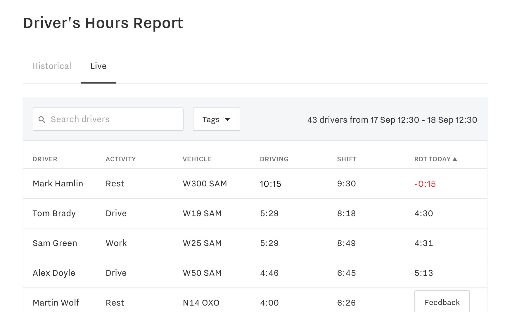 Live tachograph status updates help you turn tachograph data into an active planning tool. With a click, transport managers can see: