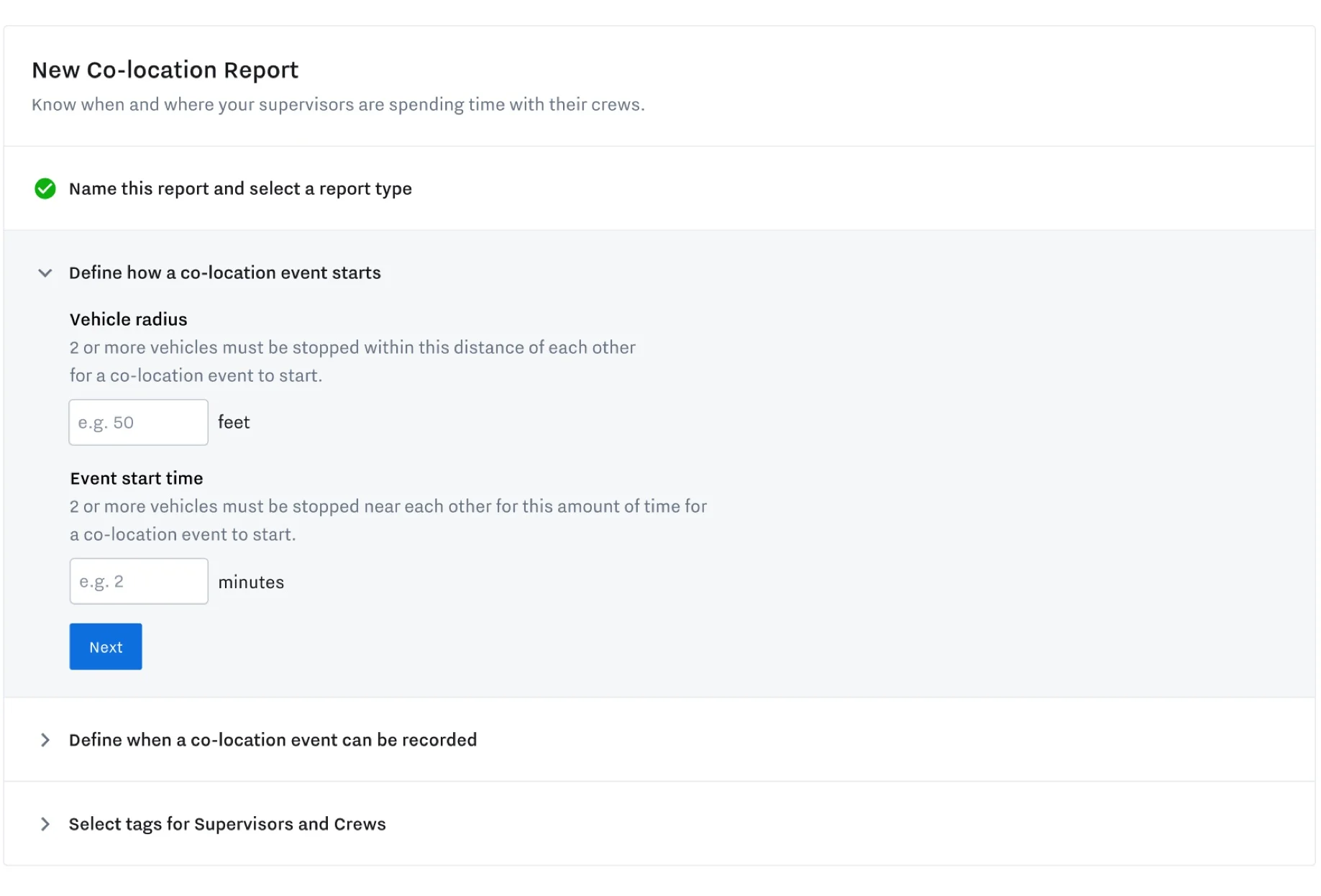 With Samsara, you can create custom, flexible reports to analyze co-location across any subset of regions, districts, or crews. To create a new report, simply: