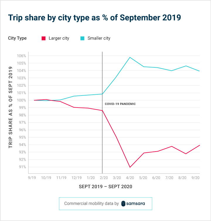 Subscribe<div id="methodology">Methodology</div>To build an understanding of commercial mobility in America’s cities, we looked at trips in the top 200 cities by population (according to census.gov) from September 2019 to September 2020. We limited our sample to customers in the food and beverage, wholesale and retail, and transportation and warehousing industries, as these are more directly related to consumer mobility.