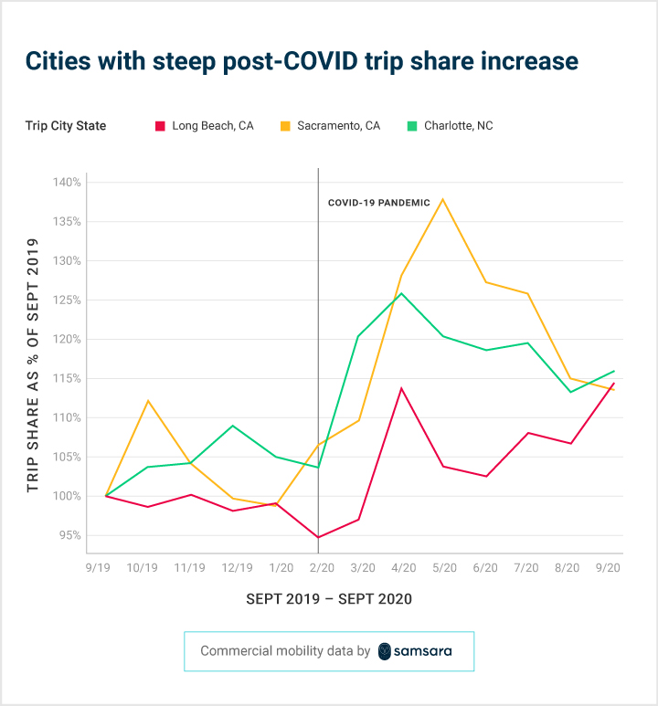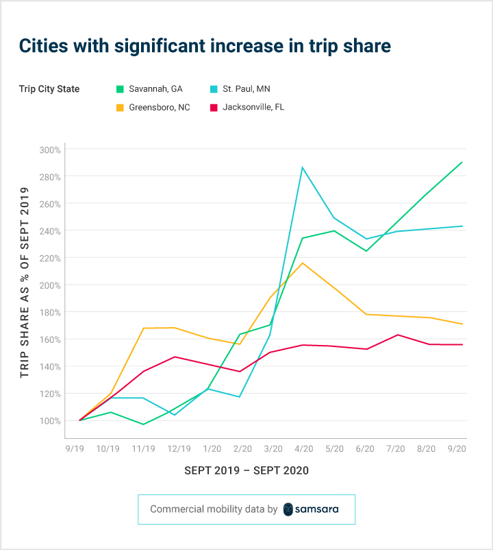Savannah, GA, Jacksonville, FL, and Greensboro, NC are among the <a href="#cities-with-large-increases">cities with the most significant increases in trip share</a>. For example, Savannah saw a nearly 200% increase in trip share, comparing September 2020 to September 2019.