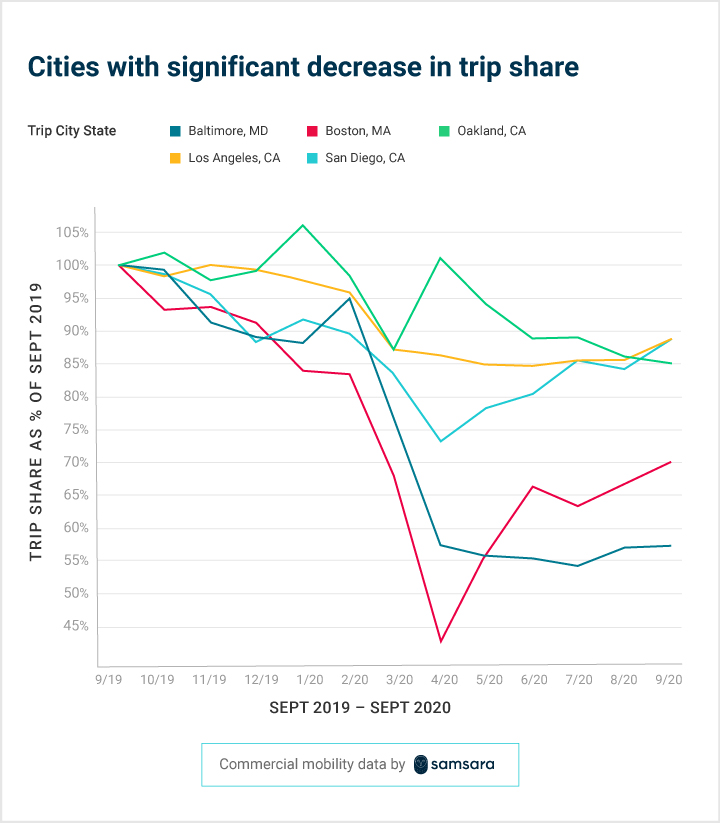 Los Angeles, CA, Baltimore, MD, and San Diego, CA are among the <a href="#cities-with-large-declines">cities with the most significant declines in trip share</a>. For example, Baltimore saw a 43% decrease in trip share, comparing September 2020 to September 2019.