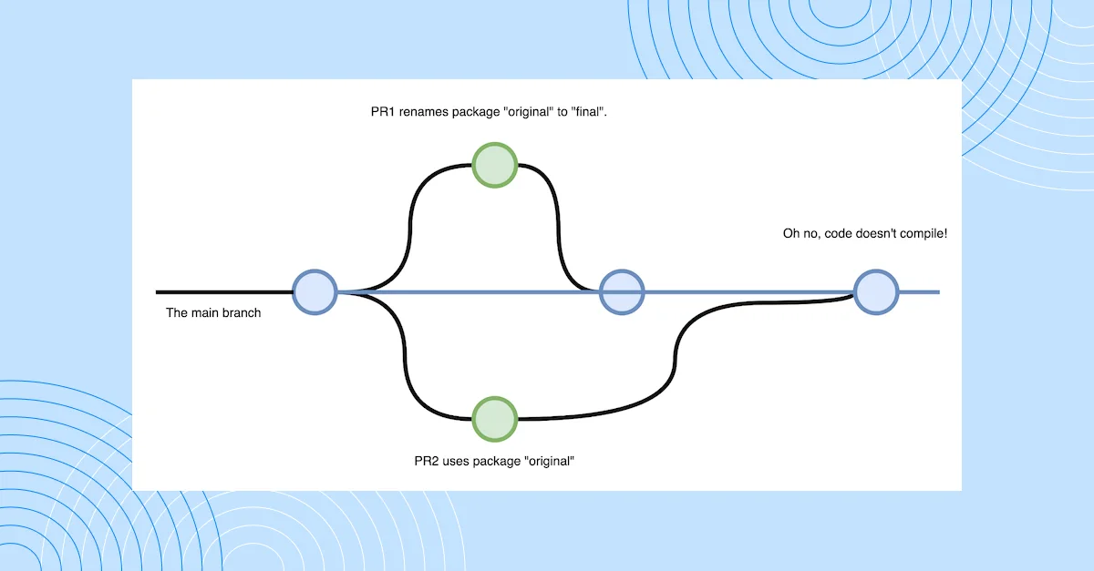 When multiple people are putting up pull requests and merging into main, the likelihood of a merge race increases. Here’s an example: