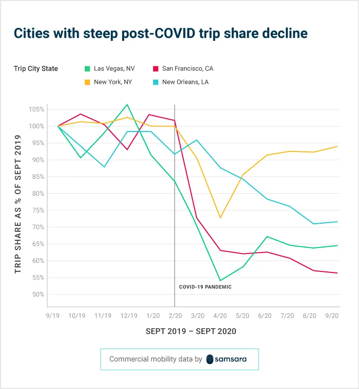 Subscribe<div id="methodology">Methodology</div>To build an understanding of commercial mobility in America’s cities, we looked at trips in the top 200 cities by population (according to census.gov) from September 2019 to September 2020. We limited our sample to customers in the food and beverage, wholesale and retail, and transportation and warehousing industries, as these are more directly related to consumer mobility.