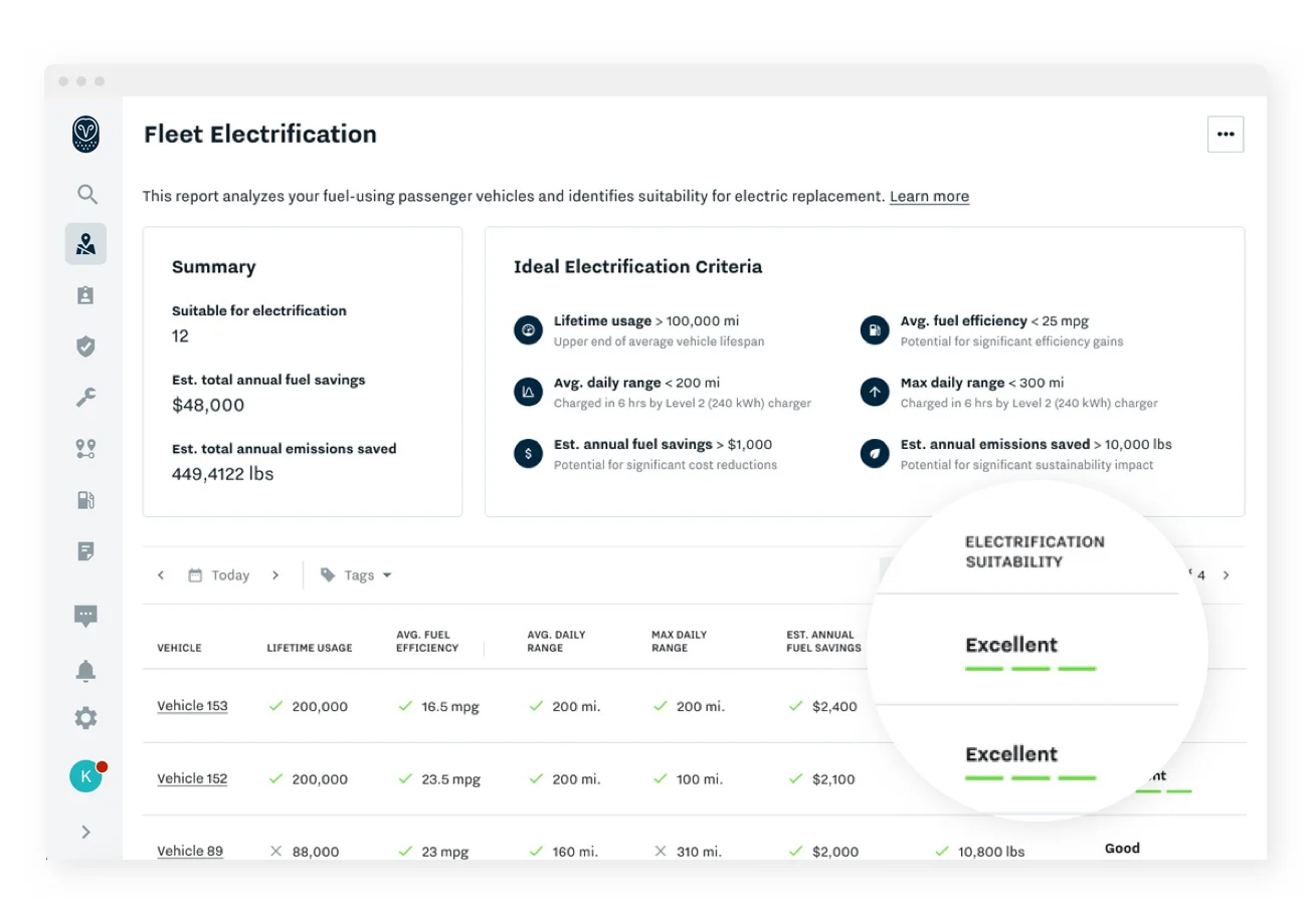 Find out which vehicles in your fleet are best suited to be replaced with an EV, using the Fleet Electrification Report. Surface the potential cost savings and carbon emission reductions, to start your electrification plans.