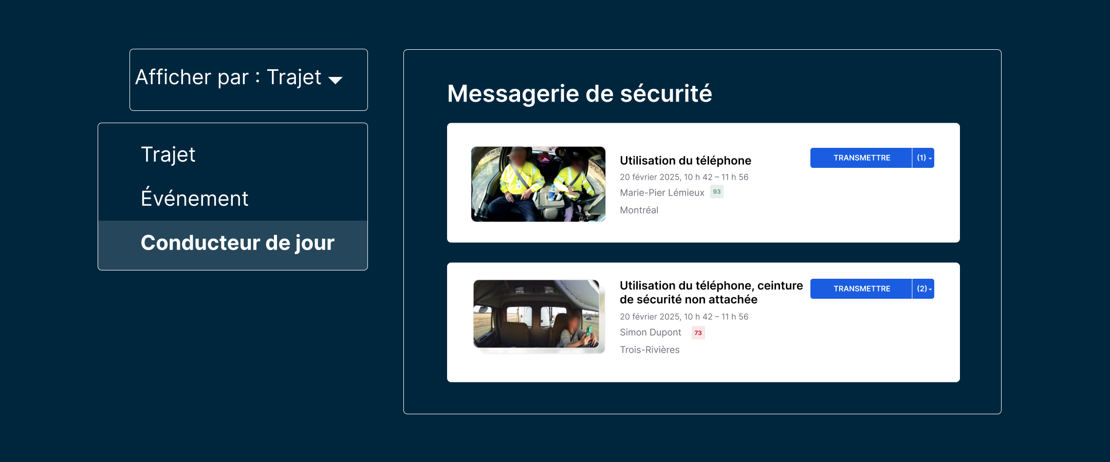 de la fatigue aux distractions en passant par les zones scolaires, la neige et les violations aux feux de circulation, les Analyses IA signalent automatiquement des dizaines de risques et de comportements routiers aux responsables de la sécurité.