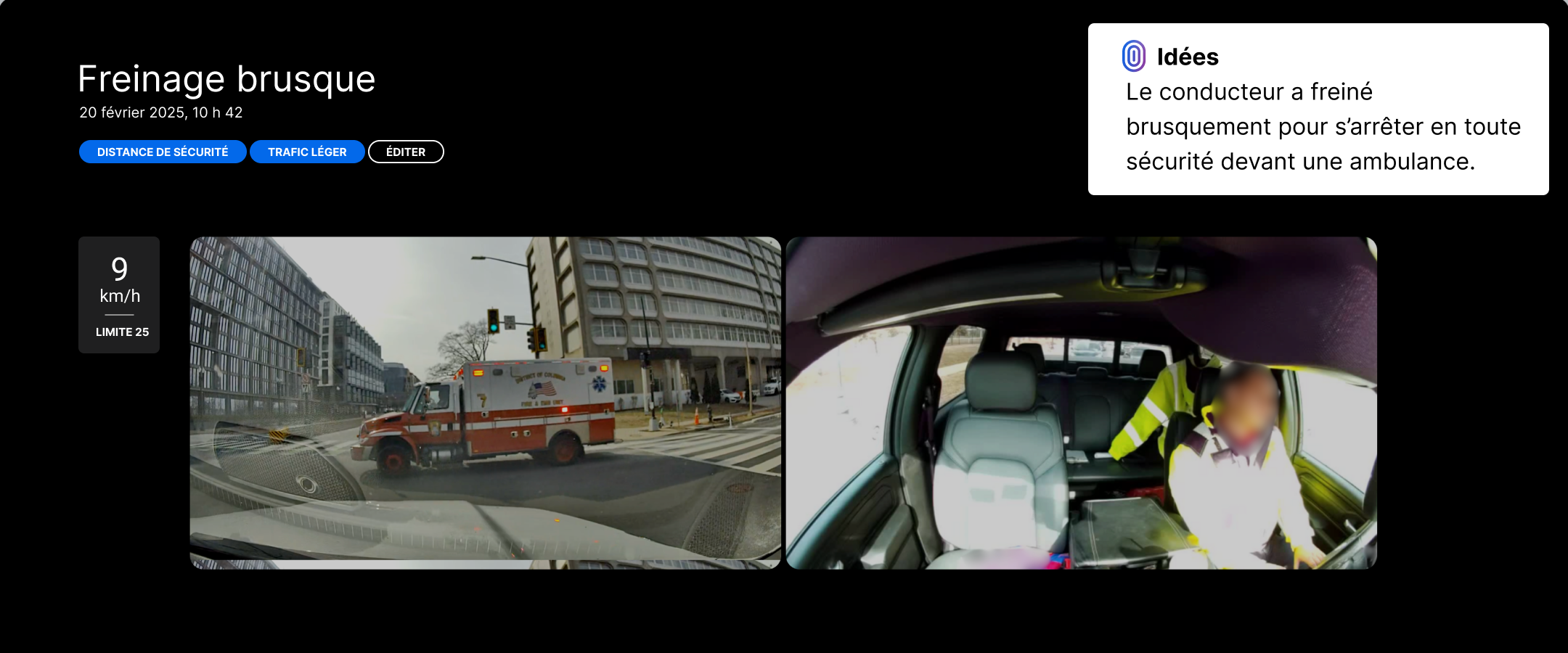 l'IA signale les moments de conduite préventive afin que vous puissiez faire la différence entre une conduite dangereuse et des actions nécessaires, et féliciter les conducteurs pour leur prudence.
