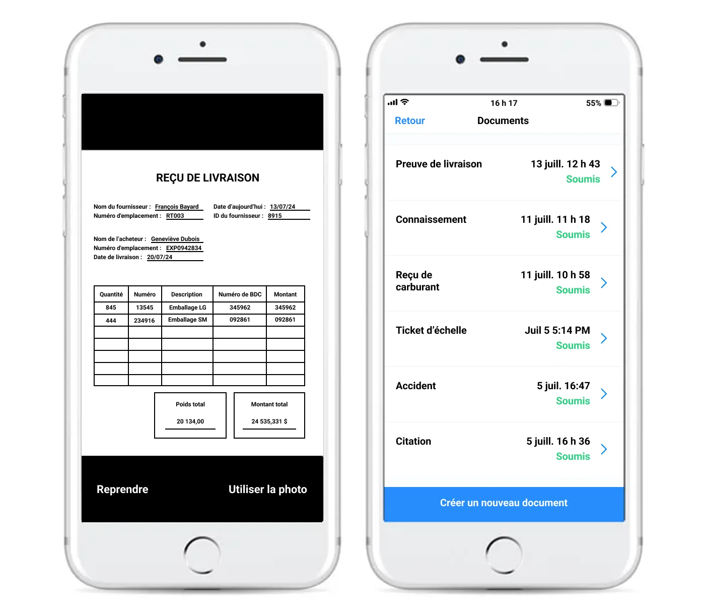 Les conducteurs peuvent prendre des photographies des bons de livraison, des connaissements, des reçus d’achat de carburant et d’autres documents en utilisant uniquement l’appareil photo intégré à leur téléphone intelligent ou à leur tablette. Les photos, les notes et toutes autres informations pertinentes sont instantanément téléchargées dans le tableau de bord Samsara.