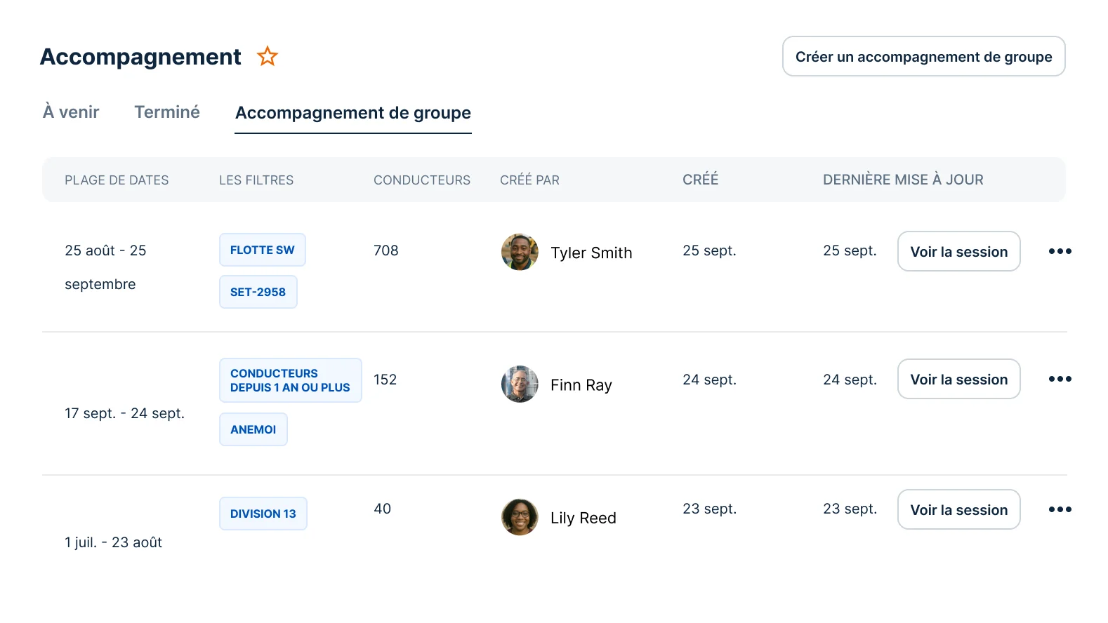 Un accompagnement efficace commence par la cohérence et la concentration. Samsara automatise le tri des événements à faible risque, fait ressortir les comportements répétitifs et fournit des résumés générés par l’IA, afin que les responsables puissent se concentrer sur l’accompagnement là où cela compte le plus. Utilisez les sessions individuelles, les modèles d’accompagnement de groupe et les auto-évaluations pour mettre en place un programme évolutif qui améliore les habitudes sans augmenter la charge de travail.