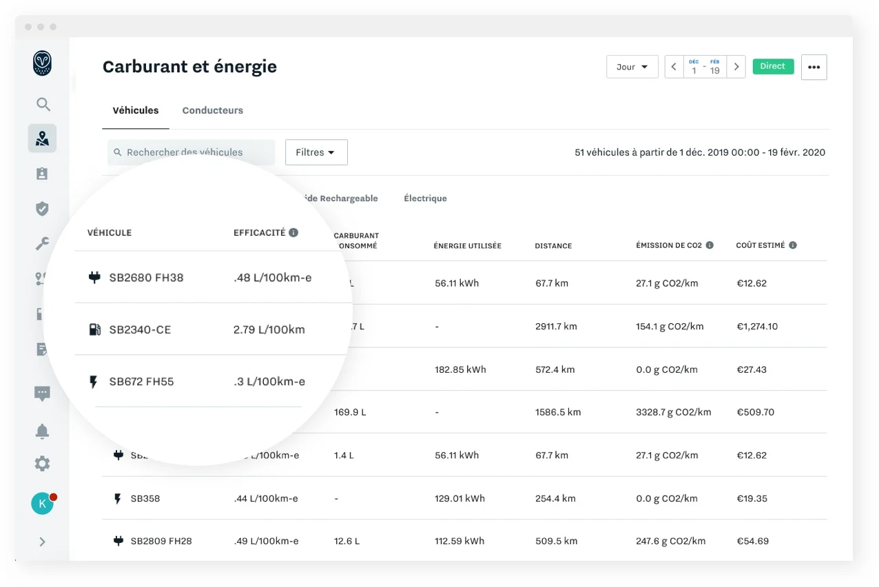 Analysez les performances de votre flotte. Que vous disposiez de véhicules thermiques, électriques ou hybrides rechargeables à carburant, assurez-vous que l’ensemble de votre flotte est utilisée de manière efficace, présente une consommation de carburant ou d’énergie optimale et respecte vos objectifs d’émissions de carbone.