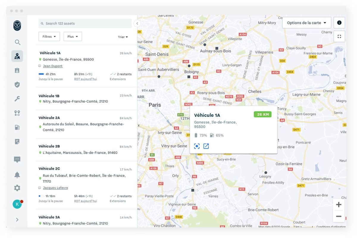 Optimisez votre flotte de véhicules électriques grâce à la superposition de cartes et à une visibilité en temps réel sur les niveaux de carburant et de batterie ainsi que sur les stations de recharge les plus proches. Assurez-vous que les véhicules en mission disposent d’un niveau de batterie suffisant pour effectuer le trajet.