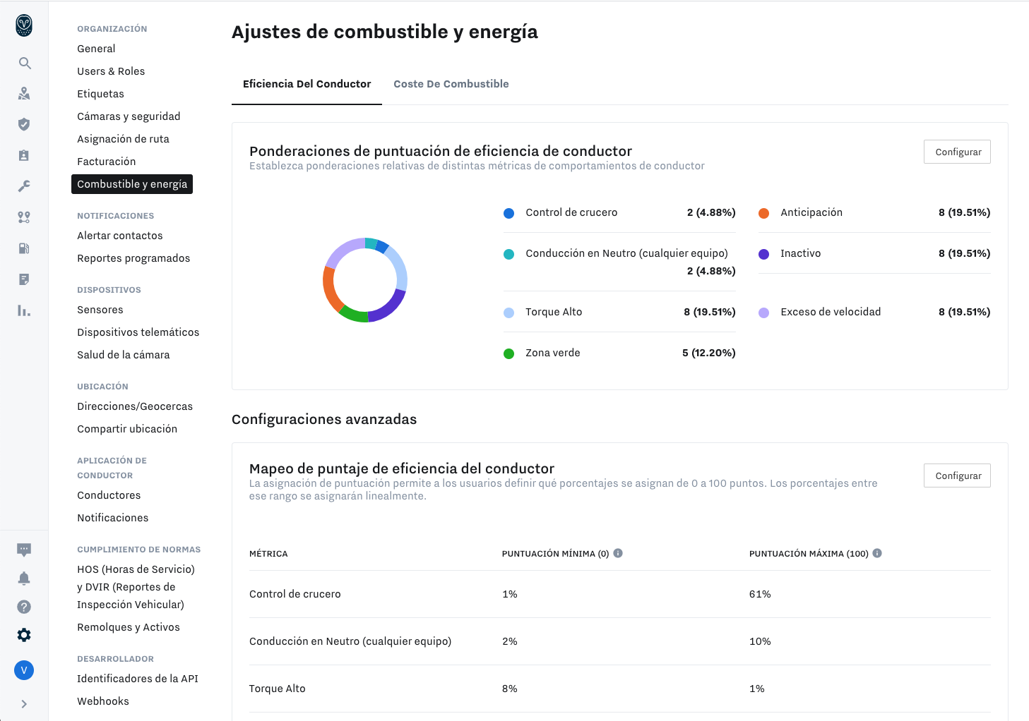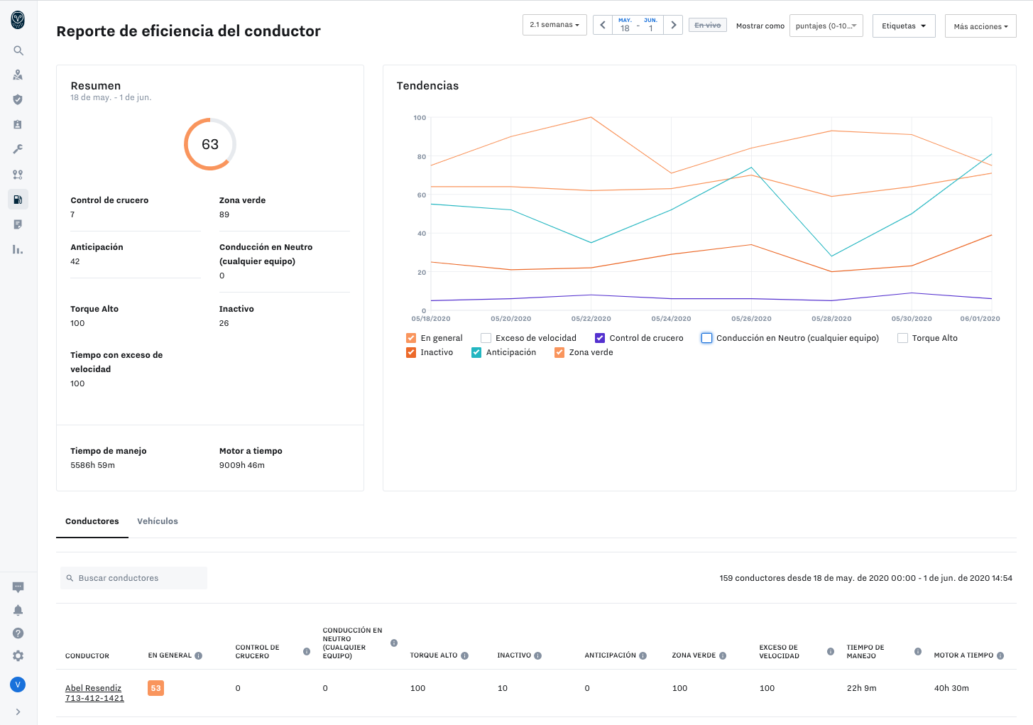 Al darle un cuidadoso seguimiento a esta información, el Reporte de Eficiencia del Conductor de Samsara puede ayudarles a establecer objetivos para su flota y ayudar a los conductores a comprender las mejores prácticas de eficiencia. Este reporte también le permite entrenar a los conductores en torno a un comportamiento eficiente de conducción. Al ayudarles a comprender exactamente lo que incluye un puntaje, pueden ver cómo se los evalúa y las formas de mejorar.
