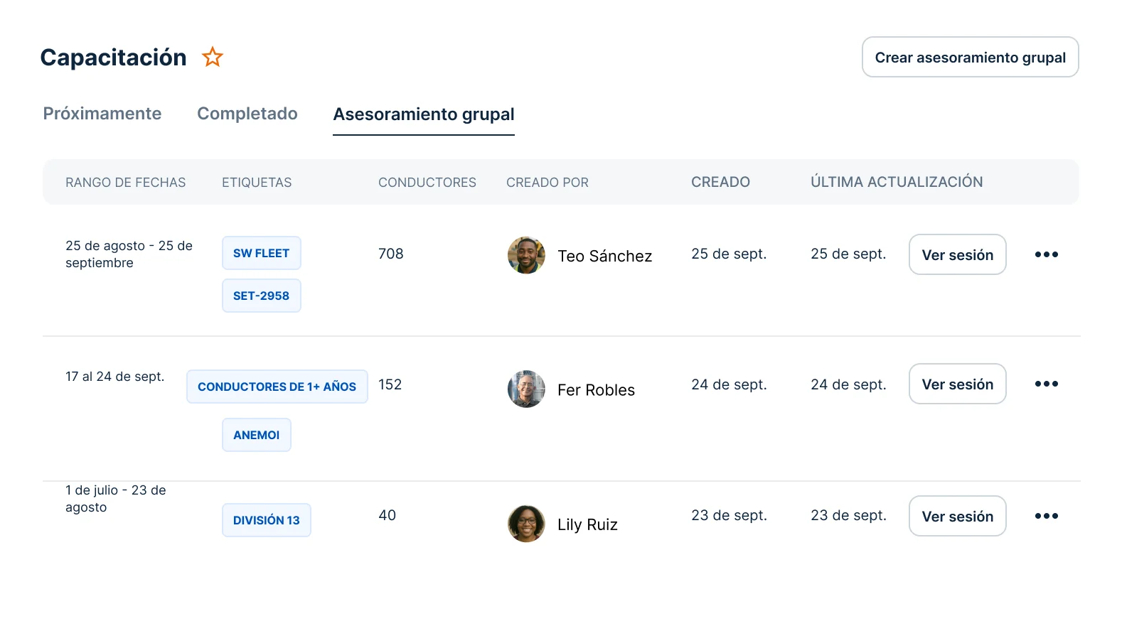 El asesoramiento efectivo comienza con coherencia y enfoque. Samsara automatiza la revisión de incidentes de bajo riesgo, destaca comportamientos repetidos y ofrece resúmenes generados por IA, para que los gerentes se enfoquen en el asesoramiento donde más importa. Utiliza sesiones 1:1, plantillas de Entrenamiento grupal y autoevaluación para desarrollar un programa escalable que mejore los hábitos sin incrementar la carga de trabajo.