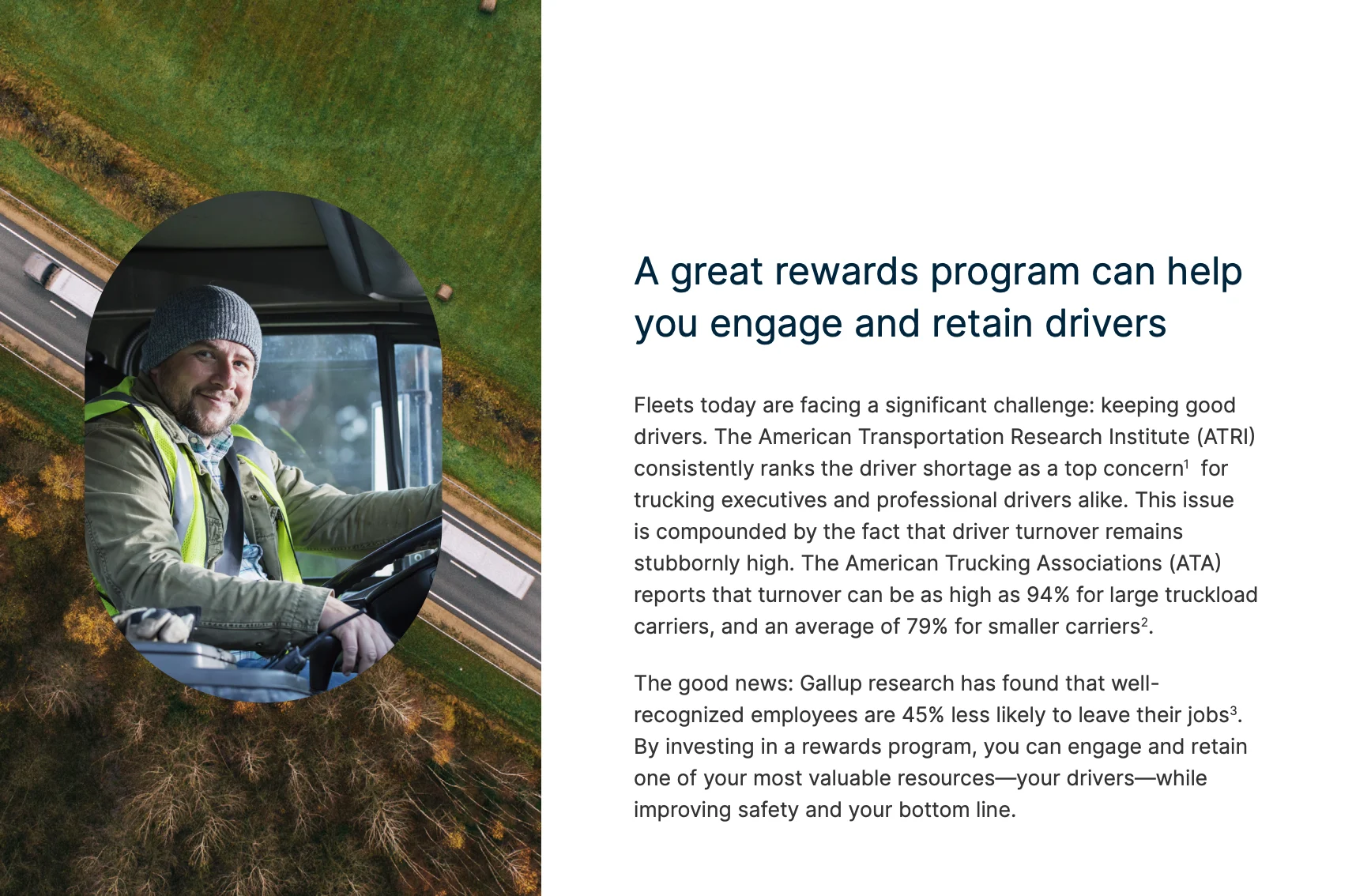 Fleets in the trucking industry today face significant challenges with driver shortages and high turnover—but research shows that well-recognized employees are 45% less likely to leave their jobs. By investing in a recognition and rewards program, you can engage and retain your most valuable resource—your drivers—while also improving safety, efficiency, and your bottom line.