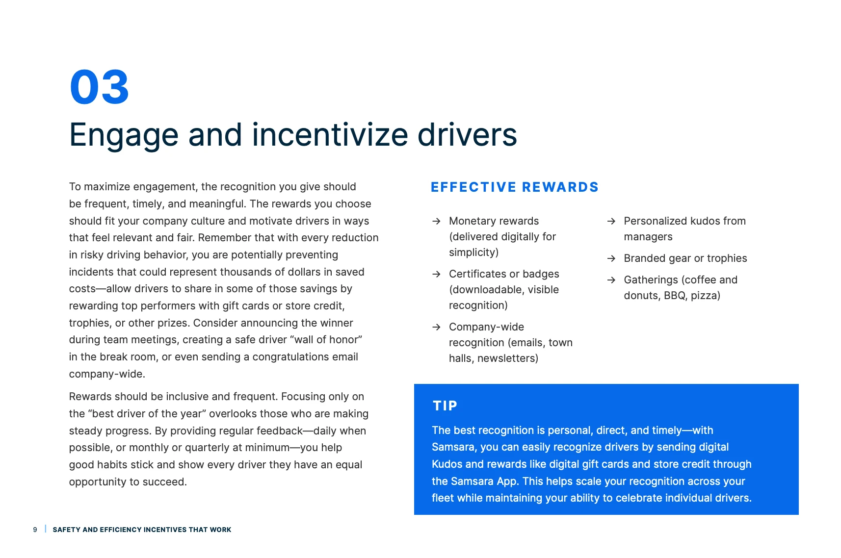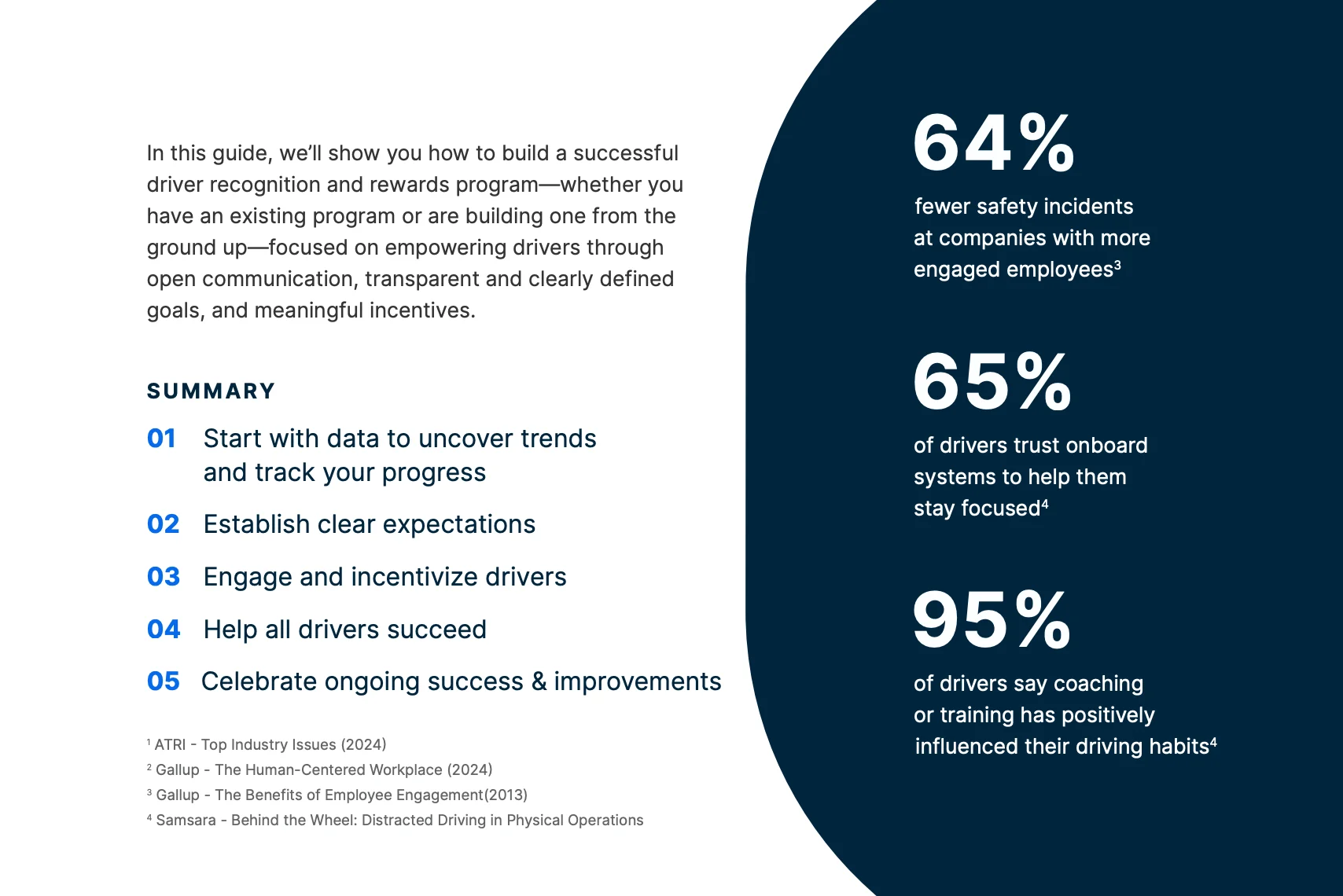 This guide will show you how to build a successful driver recognition and rewards program—whether you have an existing program or are building one from the ground up—focused on empowering drivers through open communication, transparent and clearly defined goals, and meaningful incentives.