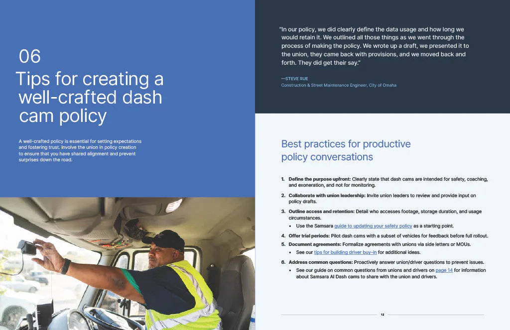 Union engagement: Learn how to approach unions early and build buy-in. From initial discussions to program rollout, leverage insights from union representatives to build an effective and sustainable dash cam program.
