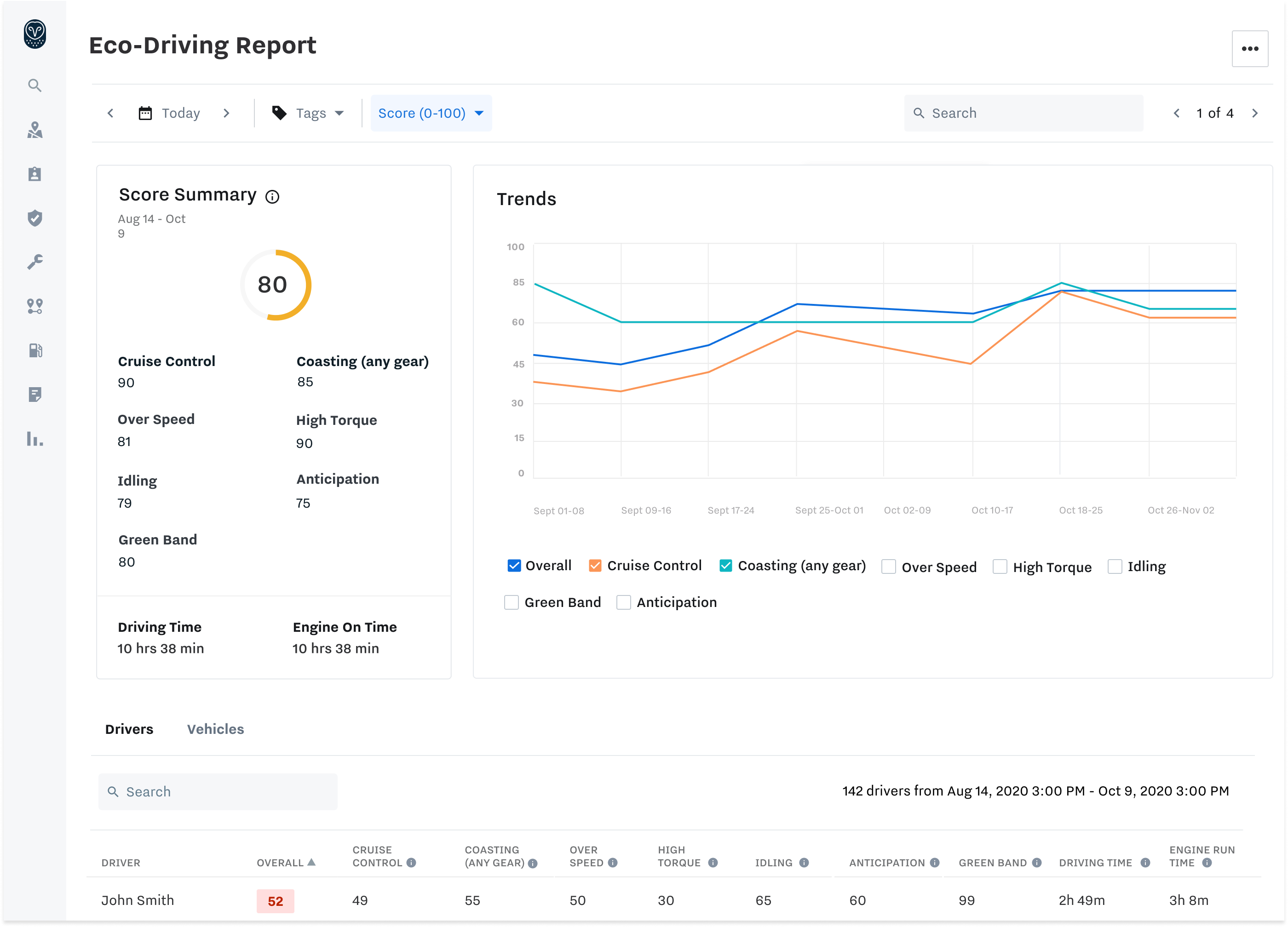 By carefully tracking this information, the Samsara Eco-Driving Report can help you establish goals for your fleet and help your drivers understand efficiency best practices. This report also enables you to coach drivers on efficient driving behaviour. By helping them understand exactly what goes into a score, they can see how they are being evaluated along with ways to improve.