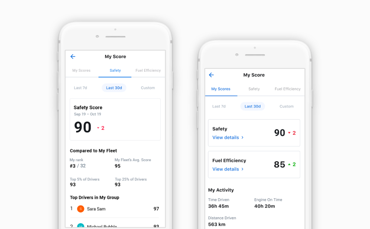 Motivate and incentivise drivers to build safe habits: Drivers want to know what they specifically need to focus on to build safe habits on the road, whether it's reducing speeding or increasing following distance. Additionally, when drivers do improve, it's important for managers to recognise them so they don't feel discouraged, unrecognised, or disengaged. As part of our elevated in-cab experience, drivers can access safety insights directly within the Samsara Driver App, enabling them to compete with peers for potential rewards by building safe habits while on the road. These include Driver Safety Scores—which empower drivers to see their safety score trends over time—and gamification through the Safety Leaderboard. By rewarding safe driving habits and celebrating positive progress, you can proactively recognise driver performance, increase engagement, and boost retention.