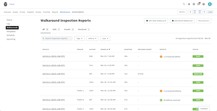 Completed walkarounds are uploaded instantly to the Samsara dashboard, giving maintenance personnel instant visibility into issues that require their attention. To help our customers adjust to new sanitisation guidelines, we will be releasing a new defect filter to the DVIR dashboard, so that you can identify vehicles in need of sanitisation at a glance.